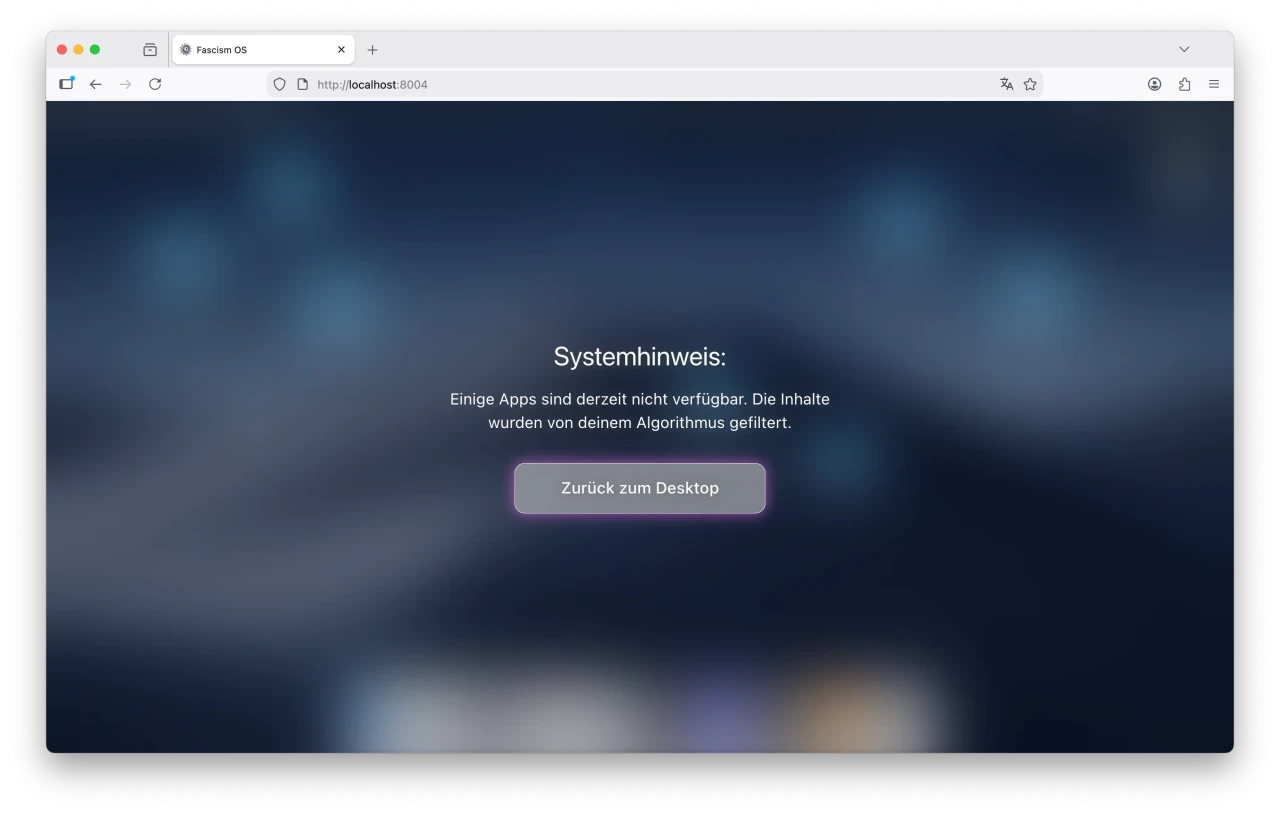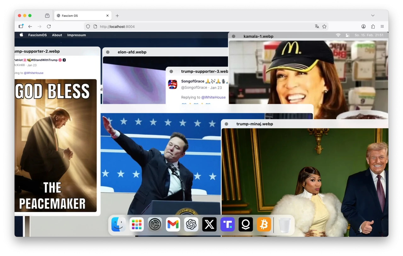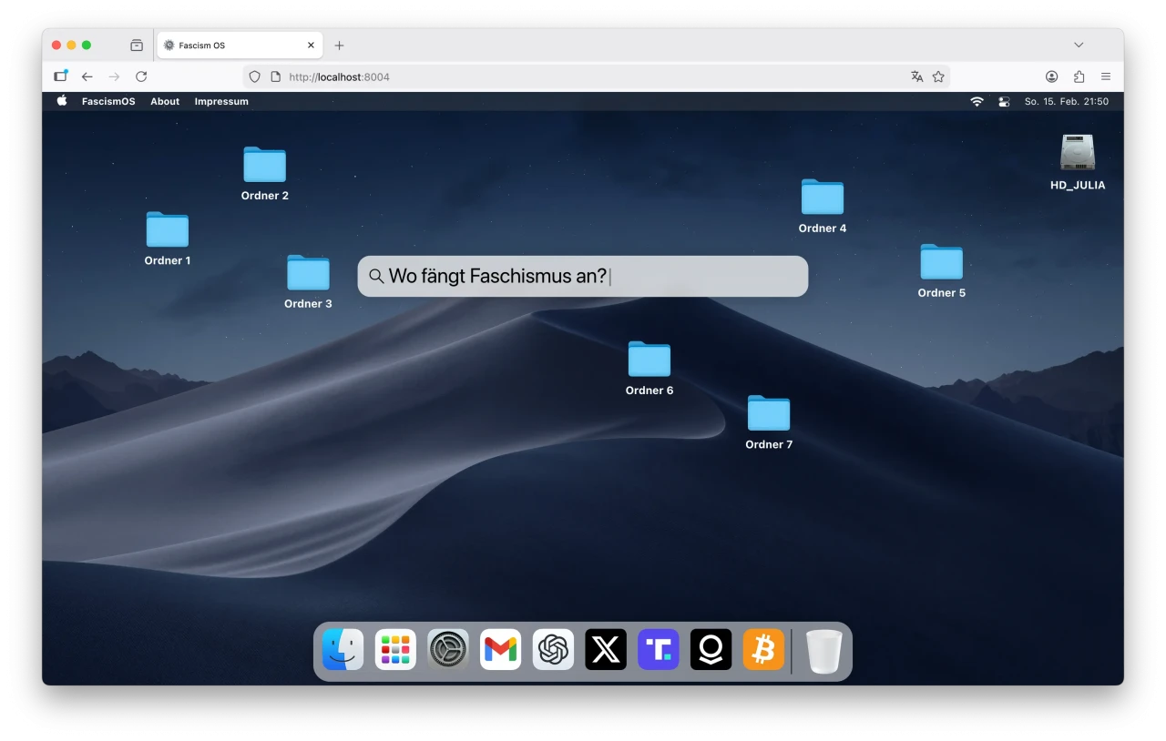»FacismOS« setzt sich experimentell im digitalen Raum mit dieser Unschärfe auseinander. Die Arbeit untersucht Machtstrukturen und autoritäre Mechanismen und lädt dazu ein, selbst Muster zu erkennen und die fließenden Grenzen von Faschismus in historischen und aktuellen Kontexten zu reflektieren. Entstanden in einem Kurs bei Prof. Aram Bartholl an der HAW Hamburg, 2026.