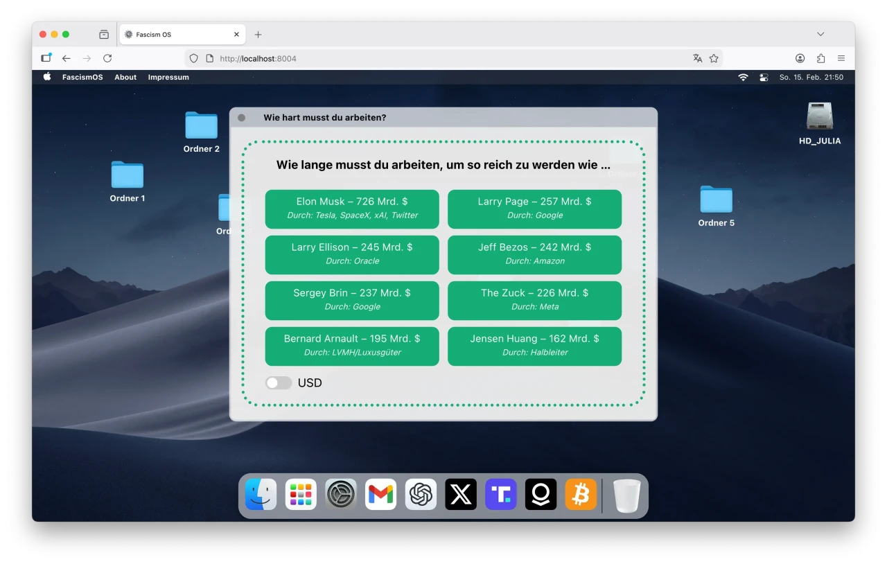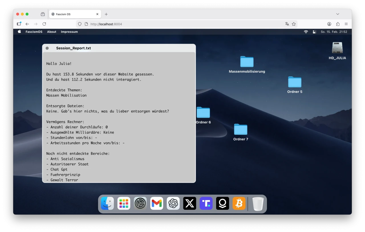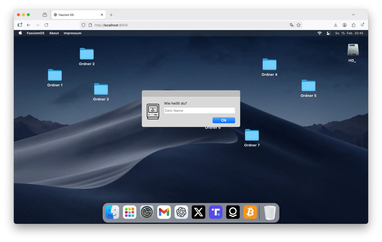 »FacismOS« setzt sich experimentell im digitalen Raum mit dieser Unschärfe auseinander. Die Arbeit untersucht Machtstrukturen und autoritäre Mechanismen und lädt dazu ein, selbst Muster zu erkennen und die fließenden Grenzen von Faschismus in historischen und aktuellen Kontexten zu reflektieren. Entstanden in einem Kurs bei Prof. Aram Bartholl an der HAW Hamburg, 2026.