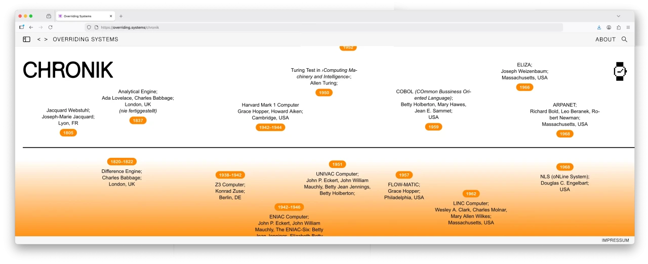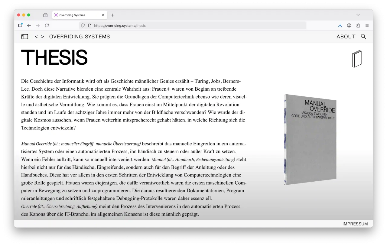 Die Geschichte der Informatik wird oft als Geschichte männlicher Genies erzählt – Turing, Jobs, Berners-Lee. Doch diese Narrative blenden eine zentrale Wahrheit aus: Frauen waren von Beginn an treibende Kräfte der digitalen Entwicklung. Sie prägten die Grundlagen der Computertechnik ebenso wie deren visuelle und ästhetischen Vermittlung. Wie kommt es, dass Frauen einst im Mittelpunkt der digitalen ger Jahre immer mehr von der Bildfläche verschwanden? Wie würde der digitale Kosmos aussehen, wenn Frauen weiterhin mitspracherecht gehabt hätten, in welche Richtung sich die Technologien entwickelten? Override meint den Prozess des Intervenierens in den automatisierten Prozess des Kanons über die IT-Branche, im allgemeinen Konsens ist diese männlich geprägt. Dieses Projekt zeigt, wie kreative Neugier und gestalterische Praxis dazu genutzt wird, um die Grenzen von Programmen und Systemen zu hinterfragen.